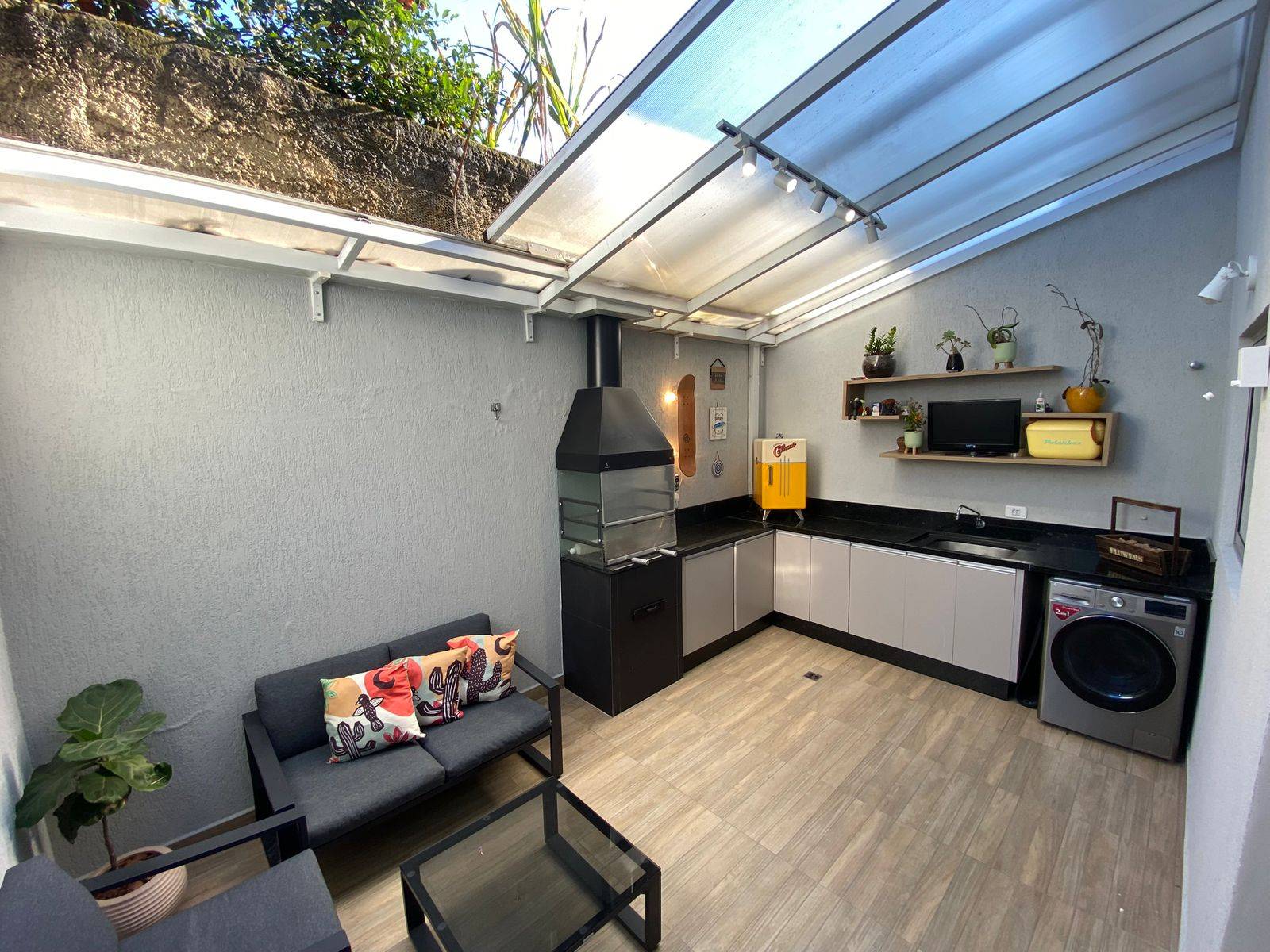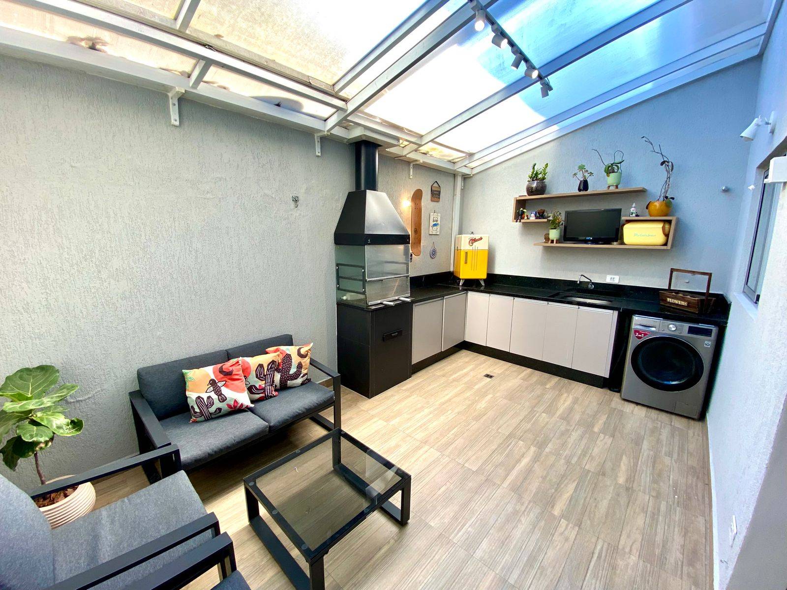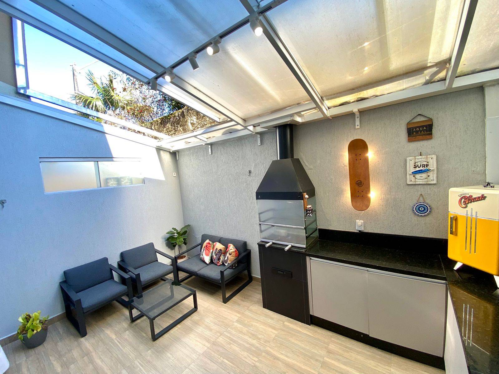 Um dos grandes diferenciais está na área externa: espaço com churrasqueira e teto retrátil, ideal para reunir amigos, fazer um almoço de domingo ou simplesmente aproveitar momentos especiais sem sair de casa.